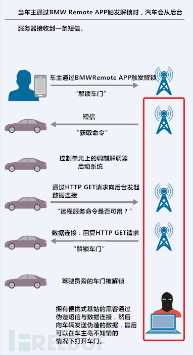 接收到短信之后,汽车大约花费一分钟启动连接到主处理单元的系统。COMBOX通过蜂窝网向宝马后台服务器发起连接,并尝试访问服务器上的数据。如果Combox没有接收到任何数据,连接被终止,什么事情也不会发生。这就意味着短信不足以打开车门,系统还需要来自后台进一步的数据。